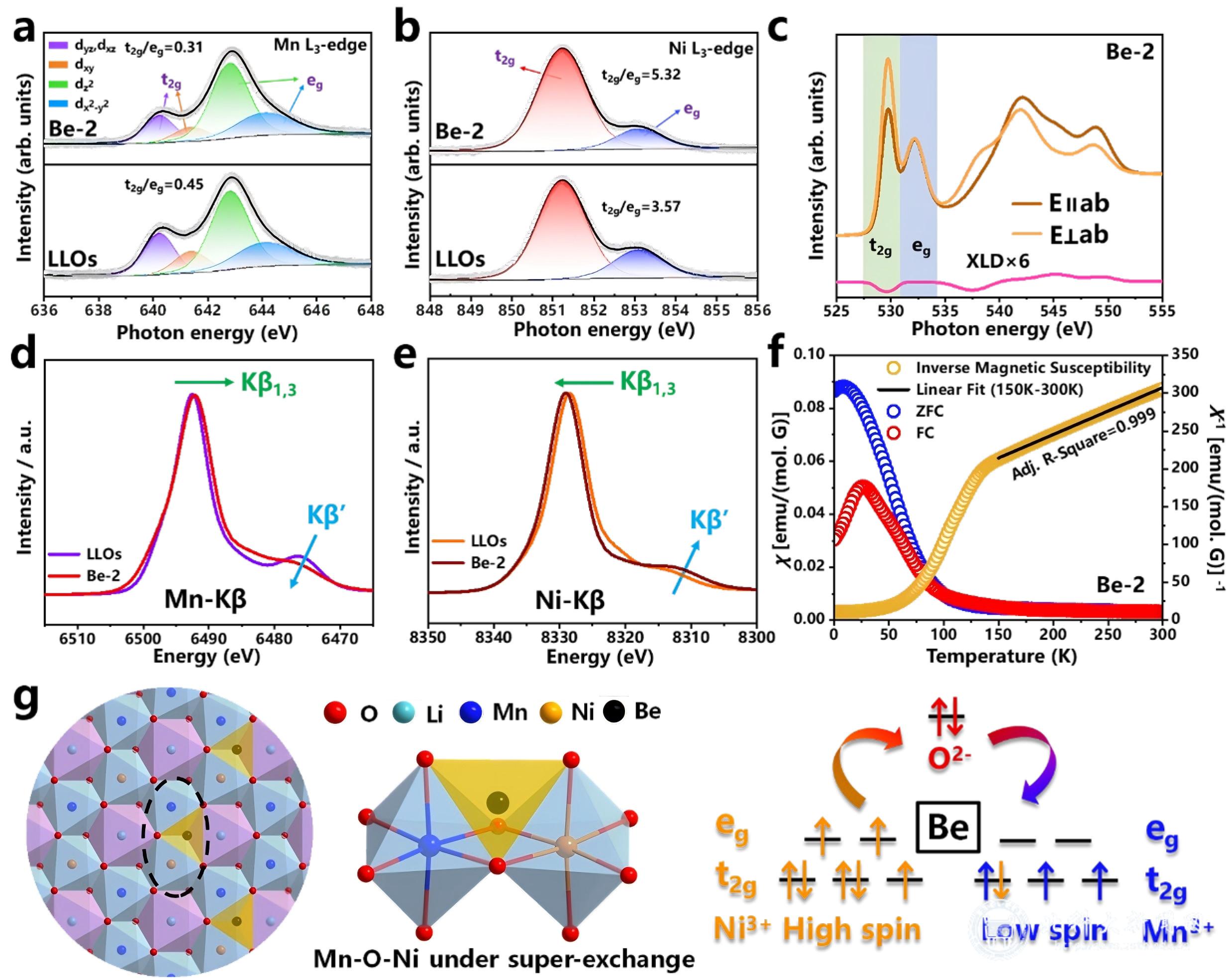 图1.超交换的作用机制。(a, b) LLOs和Be-2中Mn和Ni的L3边的EXAFS结果;(c) Be-2中O K边的归一化XLD结果;(d, e) LLOs和Be-2中Mn和Ni 的Kβ XES结果;(f)Be-2的磁化率分析;(g)Be-2中的Ni-O-Mn结构和电子结构示意图。