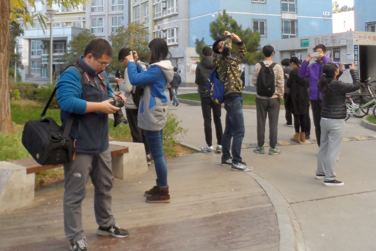 本次摄影实践体验活动采用校园风光随拍的形式。活动中,宣传骨干同学们根据预定路线对特定校园景观进行图片拍摄。同学们每到一处,都仔细观察分析校园建筑、道路、绿化带的基本特征,变换位置和角度,认真地进行拍摄尝试。陈曦老师结合校园景观摄影的基本特点,为同学们介绍了单反摄影的基本原理、常见图片构图类型、摄影光线运用、相机参数基本概念等知识,提高了同学们的摄影热情。参加活动的同学们积极进行现场交流,在互相学习中实现技能提升。