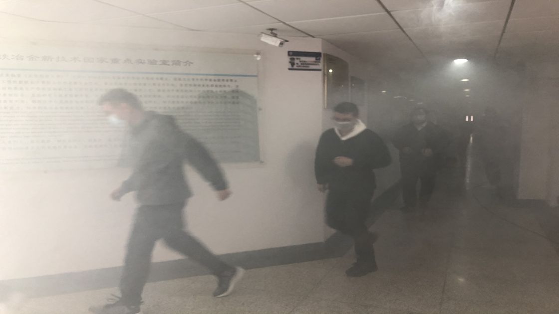 14:30,各楼层疏散员和参加演习的工作人员于指定地点待命,总指挥张百年宣布演习开始,保卫处在十楼和一楼释放烟雾。师生根据每个楼层疏散员的指挥,井然有序地从各楼层疏散到一层大车间广场,按照三个单位集合并清点人数。
