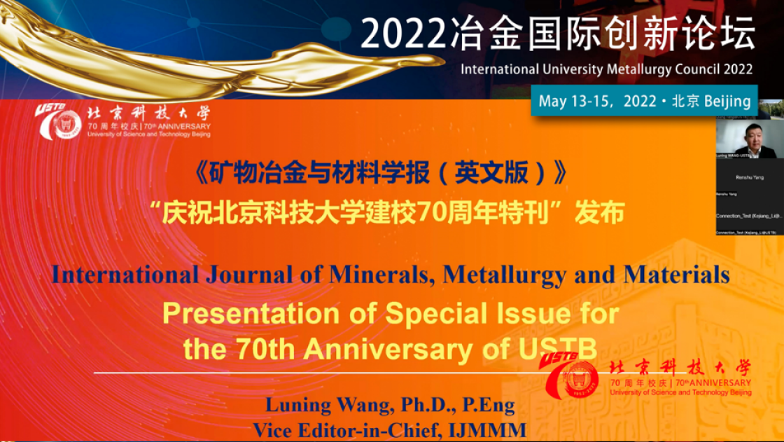 副校长、《矿物冶金与材料学报(英文版)》(IJMMM)副主编王鲁宁作开幕式特邀报告,宣布校庆特刊的发布。特刊由中国科成人直播 院士徐冠华作序,并邀请了全球矿业工程、冶金工程、材料科学与工程领域28位院士和高水平学者就相关领域的发展前沿、研究现状、技术挑战、创新成果与未来展望进行研究和综述。与会嘉宾与成人直播 师生、期刊读者和作者们共同见证了成人直播 70年成长壮大的辉煌历程。