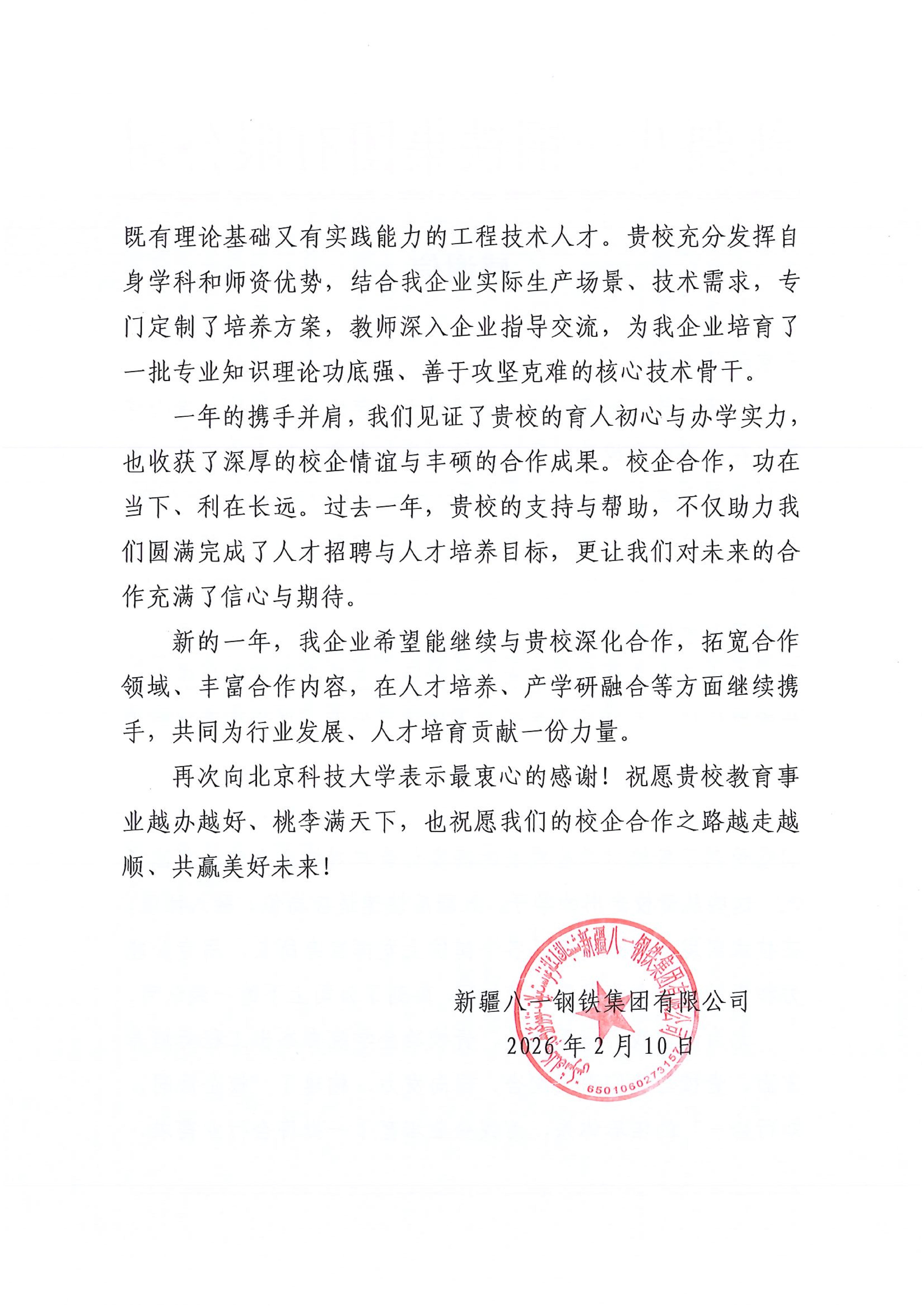 2月10日,新疆八一钢铁集团有限公司向成人直播 发来感谢信,特别对成人直播 在杰出工程师培养方面的卓越贡献给予高度肯定。信中感谢成人直播 坚守育人初心,通过构建“校企协同、知行合一”的培养体系,为企业量身定制培养方案,输送了一批理论基础扎实、实践能力突出、善于攻坚克难的核心技术骨干。这些毕业生在技术研发与生产运营岗位上快速成长,成为推动企业高质量发展的中坚力量。八一钢铁集团表示,愿与成人直播 进一步深化校企合作,拓宽合作领域,在人才培养与产学研融合方面携手共进,共创美好未来。