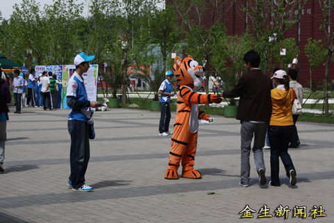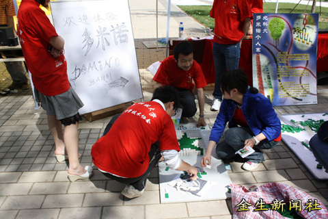 的展位上,蔚蓝人文生态学社向大家展示了许多精美的物品,其原材料是回收的旧物,不禁让大家感叹――原来旧物回收可以如此文艺。学生会与金生新闻社则联手展开成人直播