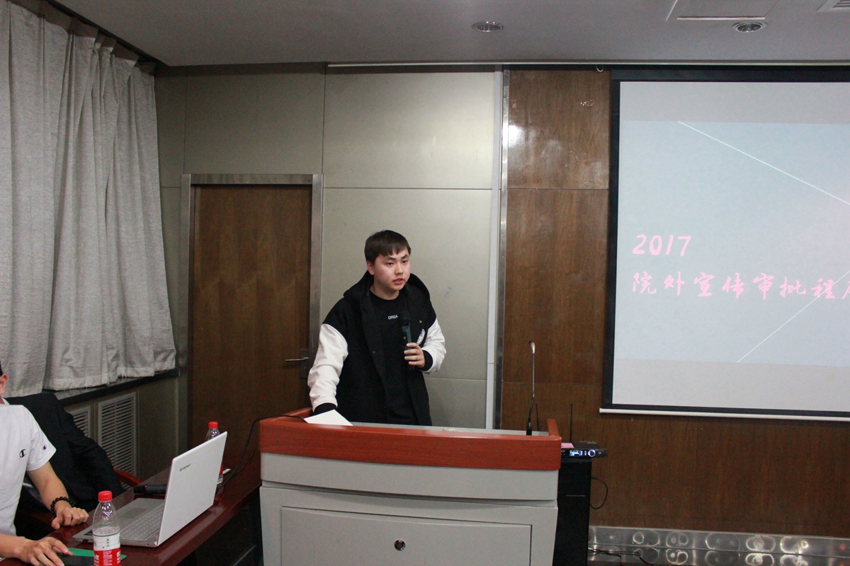 学生会办公室部长潘凌峰同学则是从公寓橱窗海报宣传审批要求出发,类推到篮球场宣传栏、食堂电子屏幕及校园网登录界面三个方面。他详细讲解了成人直播 外宣传的基本章程制度以及注意事项,提出“未雨绸缪”四字箴言,告诫同学们校外宣传要提敲定,提前审批。简明扼要地对各种宣传方式的注意要点、操作程序及步骤进行了详细剖析。