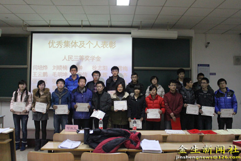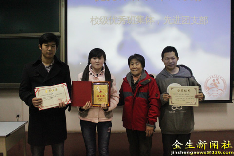 何淑兰老师发表了语重心长的讲话。何老师首先祝贺获奖的集体与同学,她引用了新东方总裁俞敏洪在北京大学开学典礼上所做演讲中的两个故事,告诉同学们大学不仅仅是一个学习的地方,更是一个人成长的地方。她希望同学们不仅要努力学习,更要学会与身边的人和睦相处。张瑜代表2011级全体学生为何老师颁发了“最佳贡献奖”,表达同学们对何老师一年来辛勤工作的感谢。