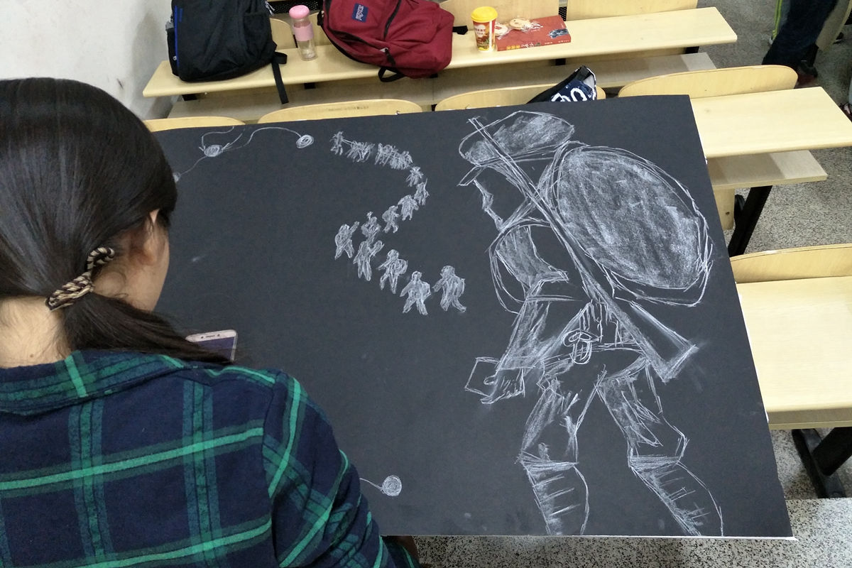每一个创作都凝聚了班集体的共同智慧,在桌子上作画不够尽兴同学们就把画板转移到地面或者黑板上,大家不断克服条件的限制,完美的完成了一幅幅壮丽的画卷。