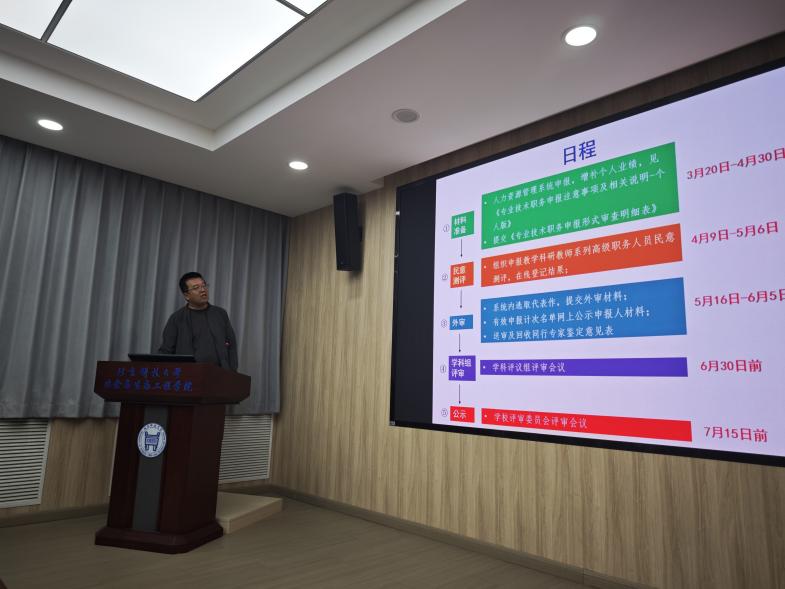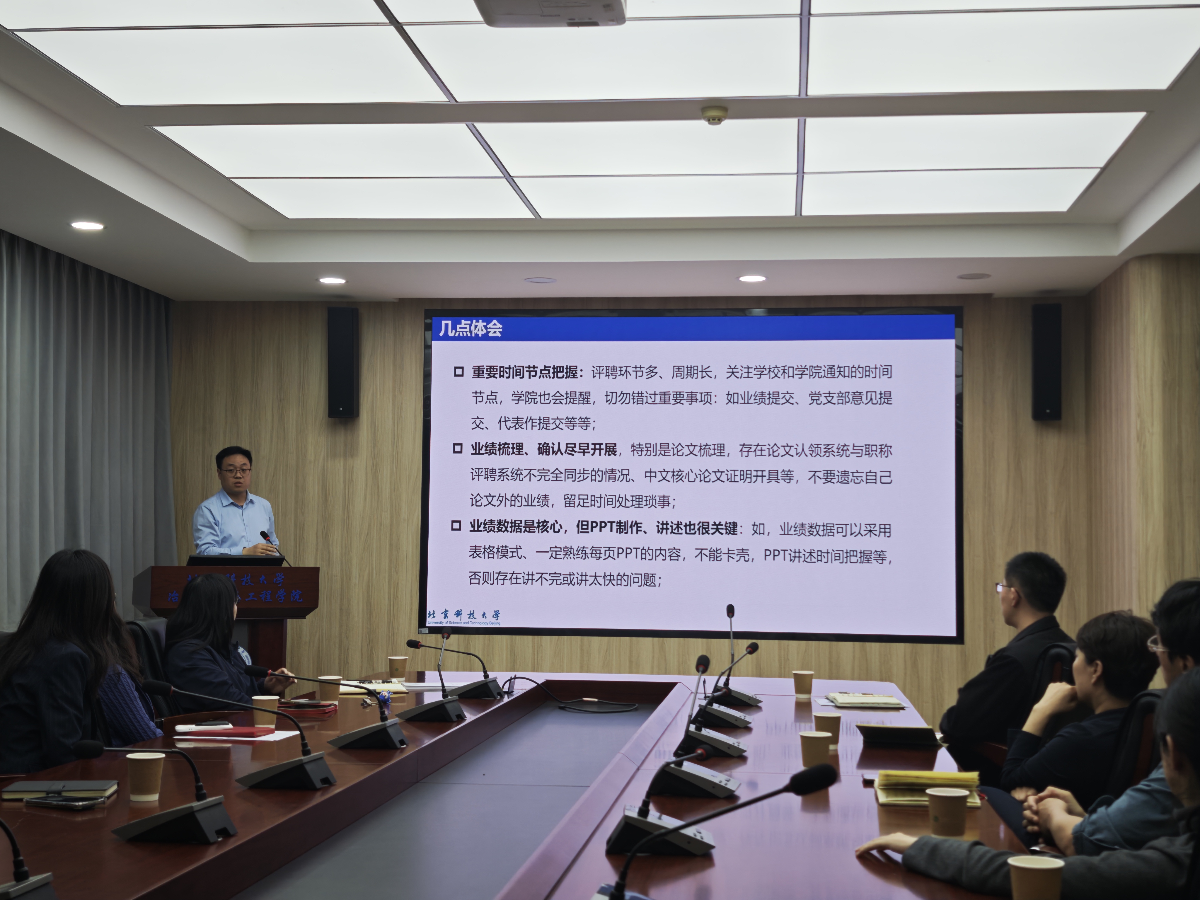 会议还邀请刘高阳副教授、张献光教授进行经验分享。两位老师结合自身申报经历,从材料准备、业绩提炼、答辩逻辑与技巧、心态调整等方面分享了实操心得,为在场教师提供了有益参考。
