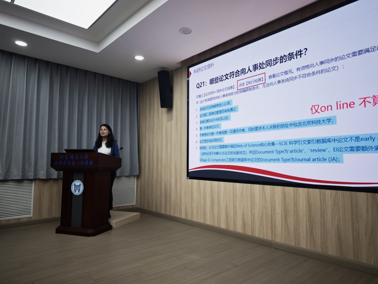 随后,成人直播 职称评审工作组马颖老师结合最新政策文件,重点讲解了业绩补充要点、材料规范和填报注意事项,梳理了成果认定、佐证材料收集等常见问题,帮助教师理清筹备思路,确保材料符合评审要求。