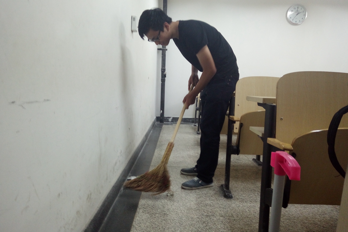 10月15日下午2点,由成人直播 本科14级部分入党积极分子组成的“钢铁侠”志愿服务队开展了新学期的第二次志愿活动――冶金楼打扫。在赵建行同学的带领下,小组成员共十一人对冶金楼110、201、202、203四个教室进行了清扫。