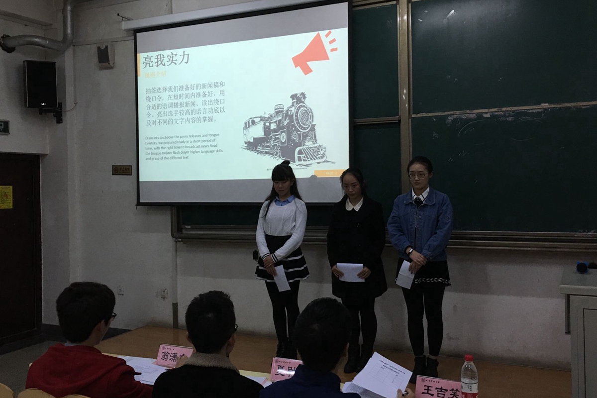 “主我青春,驰骋北科”本次主持人大赛共分为展我风采、亮我实力和秀我反应三个环节进行。在展我风采环节里,选手提前准备好诗歌、散文等,有感情地进行一分钟朗诵。本环节主要考验选手的普通话、发音、形象以及舞台表现是否得体。通过第一轮的比赛,有10位选手脱颖而出进入第二轮。随着比赛进行,比赛难度加大,在第二轮“亮我实力”环节中选手们抽签选择早已准备好的新闻稿和绕口令,经过短时间的准备后,用合适的语调播报新闻、读出绕口令。本环节对选手的语言功底以及选手对不同的文字内容的掌握要求较高。最终,得分最高的5名选手成功进入第三轮的比赛。评委对晋级选手给予点评,为选手们下一环节更精彩的表现打下良好的基础。