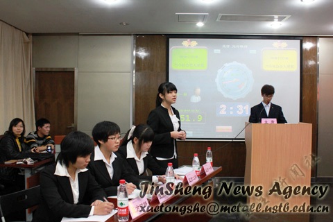 “钢魂杯”新生辩论赛半决赛在青钢报告厅顺利举行。出席本场比赛的评委有:院团委学生副书记陈炽昱、连聪,院学生会副主席汪毅捷、08级院辩论队队员柴琳、09级院辩论队队员陆鹿和朱经纬。