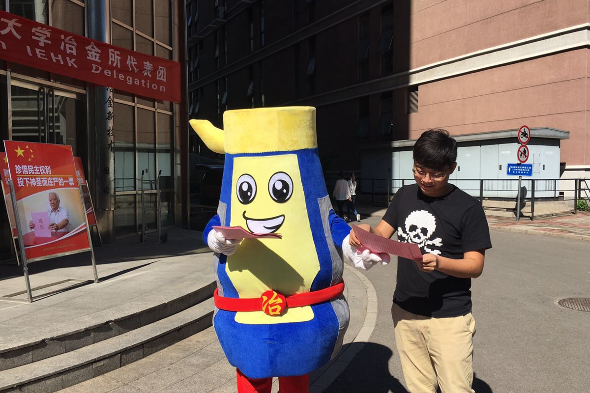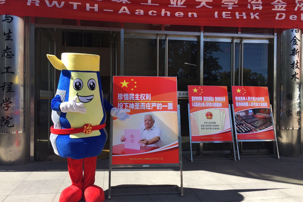 吉祥物“炉宝”为各位师生积极宣传换届选举知识,发放《致全区选民的一封信》。醒目的“主动参加选民登记,依法行使选民权力”条幅一目了然,成人直播