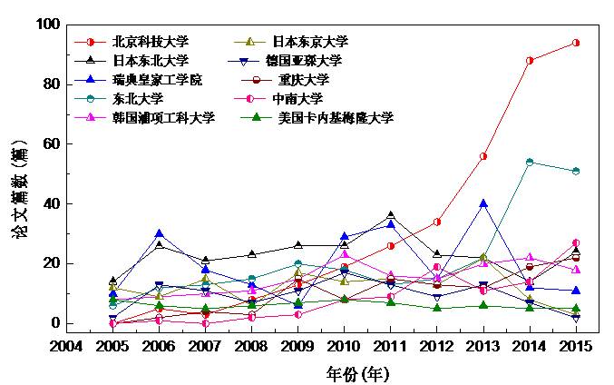 图2 排名前十的世界大学在四大期刊上(MMTB、ISIJ、Steel Research International、Ironmaking & Steelmaking)的发表文章的数量