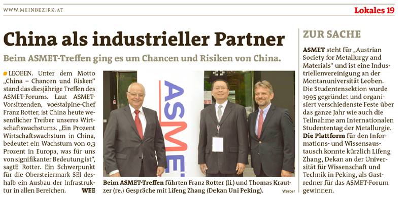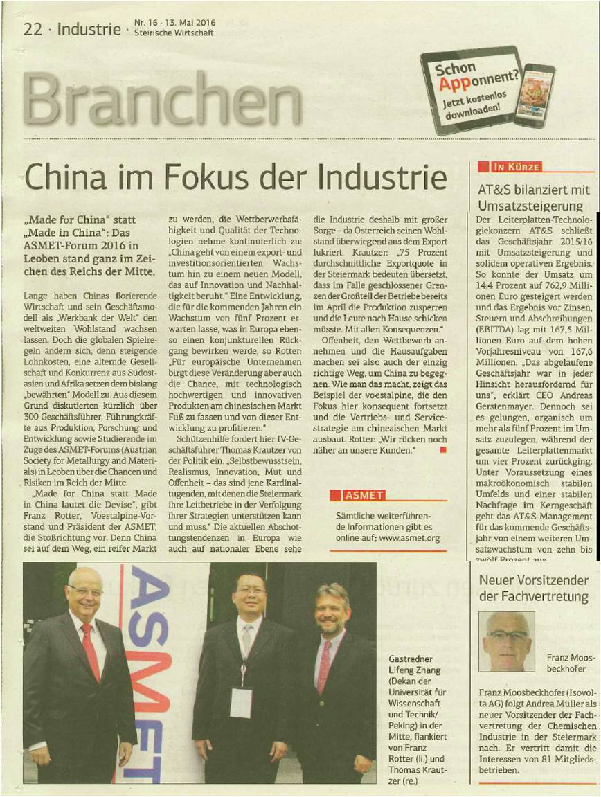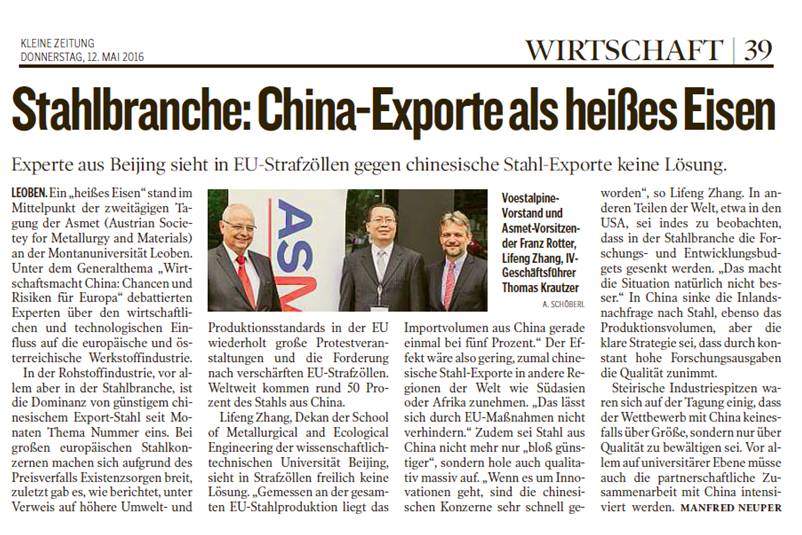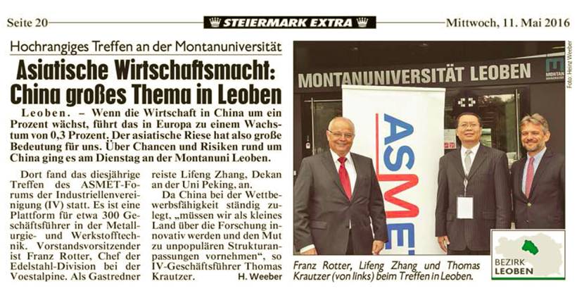 2016年5月10日至5月11日,2016年奥地利冶金与材料论坛会议在奥地利莱奥本大学顺利举行,主题为“中国的机遇与风险”。出席会议的有欧盟若干钢铁企业主要负责人、相关大学的教授和学生代表。会议主要讨论中国与欧盟在钢铁方面的未来的竞争与合作。5月10日上午,会议开幕式在莱奥本大学的会议中心举行。会议主持人奥地利冶金与材料协会主席Bruno Hribernik博士致欢迎辞并介绍会议的基本情况。