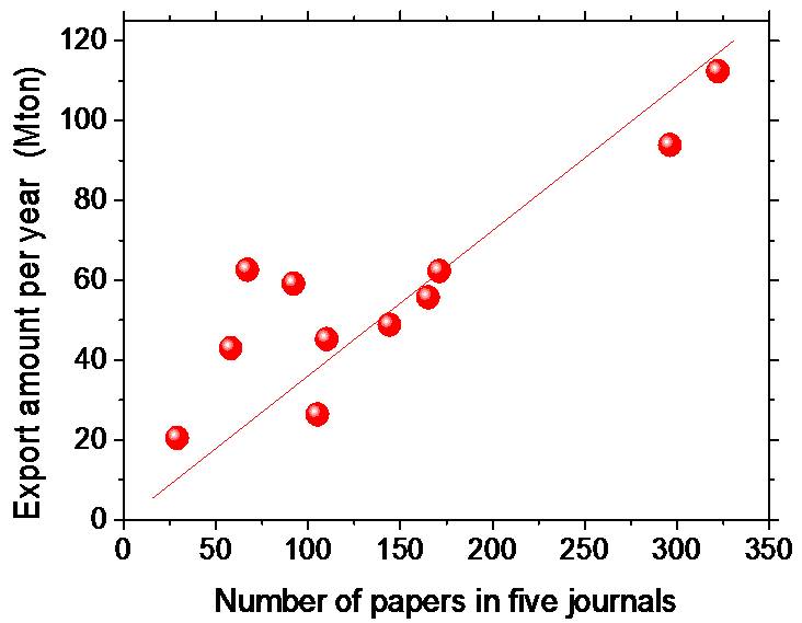 已经遥遥领先、世界第一(图2)。统计还发现,中国钢铁的出口量和中国学者在国外五大期刊发表文章的数量成线性相关(图3),这充分表明科技进步对中国钢铁生产、钢铁质量和钢铁出口的促进作用。