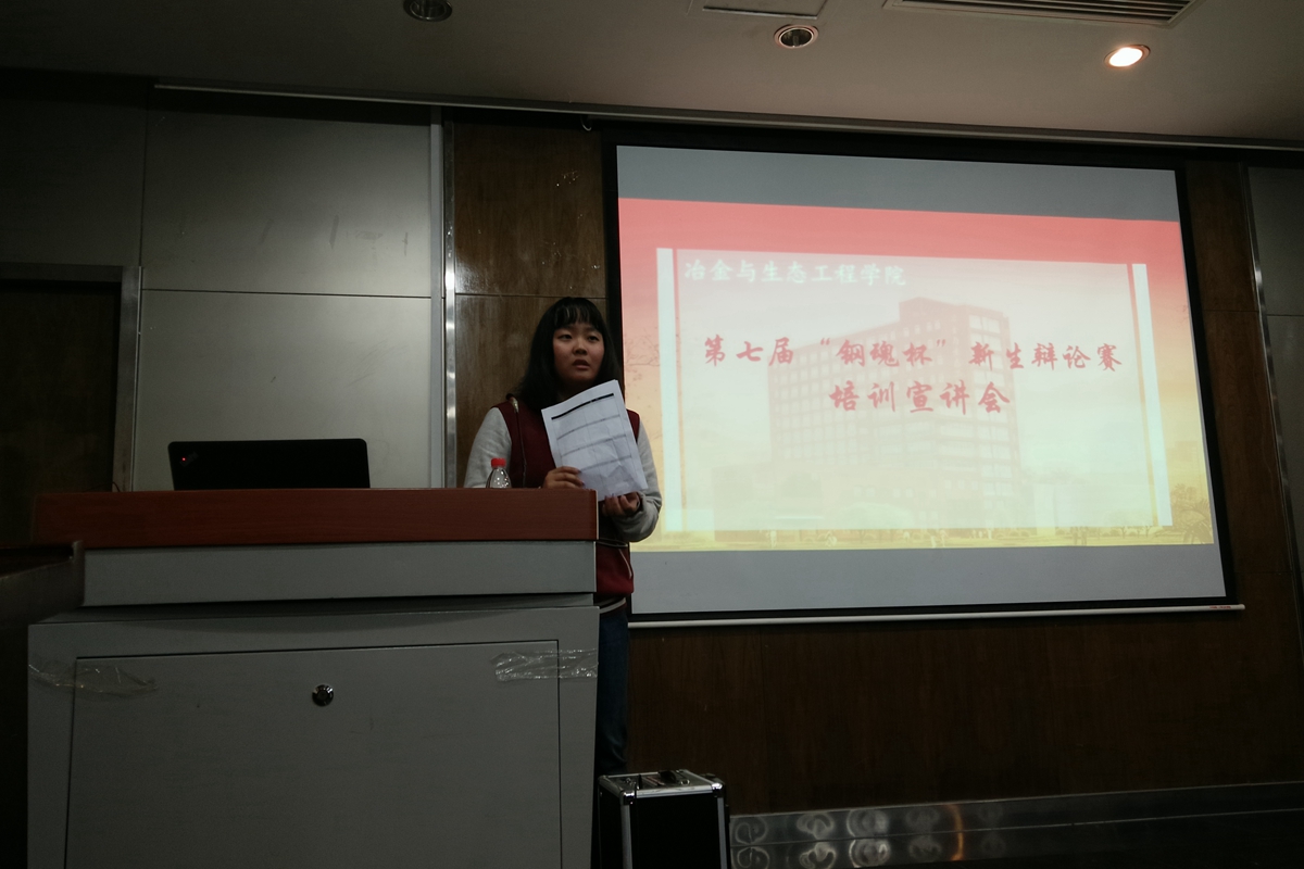 10月16日晚,成人直播 第七届“钢魂杯”新生辩论赛培训宣讲会在冶金楼青钢报告厅顺利召开。本次培训宣讲会由冶金1502班王甜雨同学主持,校立言辩论队队长樊婧同学、副队长张静远同学、程婉婷同学对参赛者进行了关于辩论赛的准备工作、辩论技巧和答辩礼仪等方面的培训。